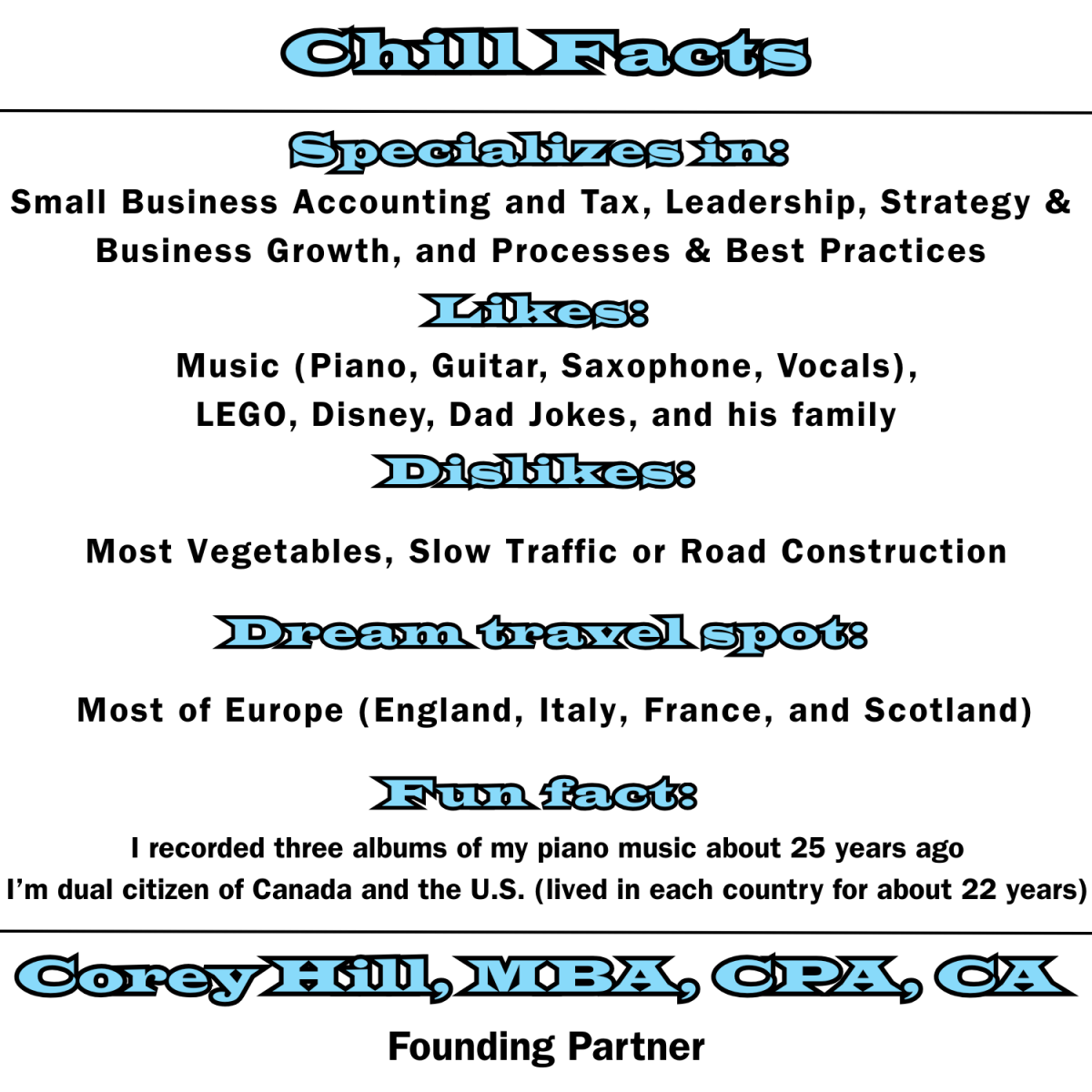 When our founder, Corey Hill, decided he wanted to start his own Edmonton based accounting firm, he had a very specific vision in mind. He wanted to take something that is traditionally seen as boring and tedious, and perhaps even painful (going to see your accountant) and turn it into an experience that would be fun and fulfilling. Every aspect of our office portrays a warm, comfortable, and inviting atmosphere that is intended to put the client at ease.